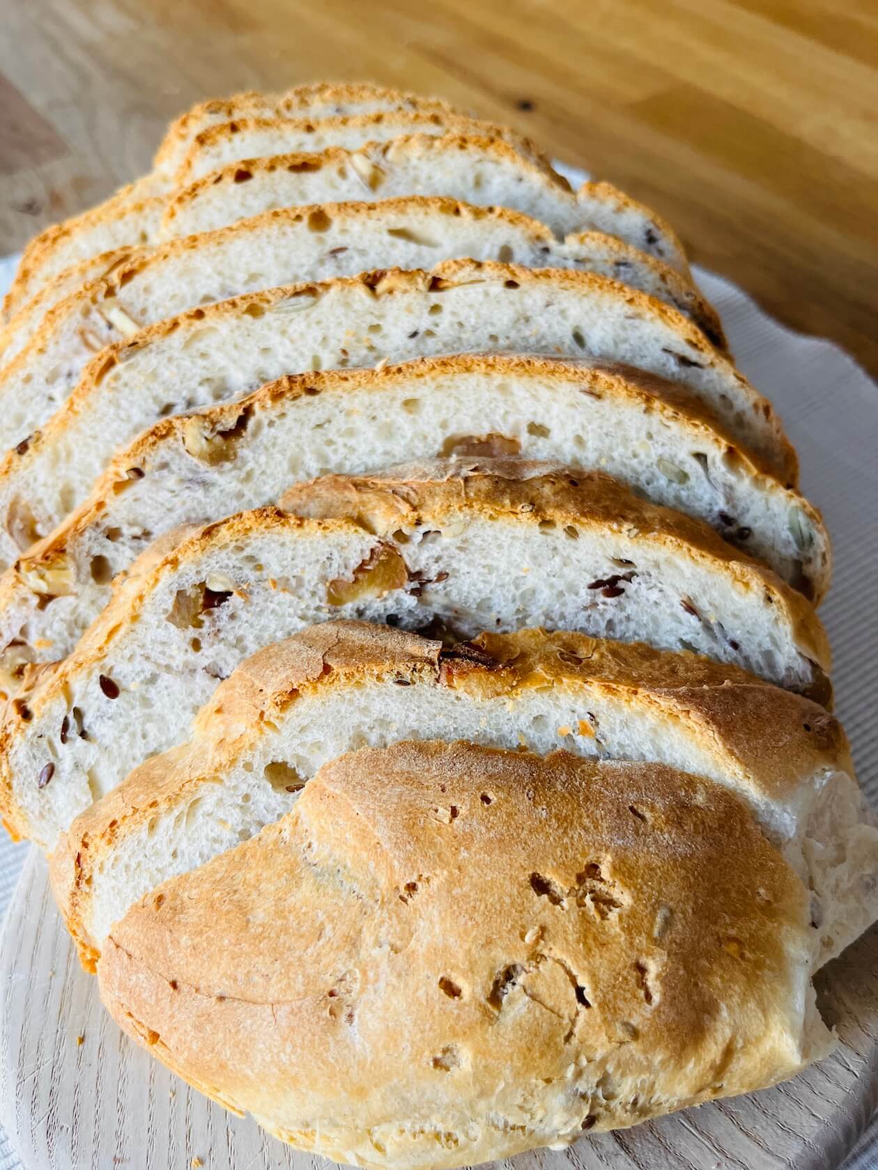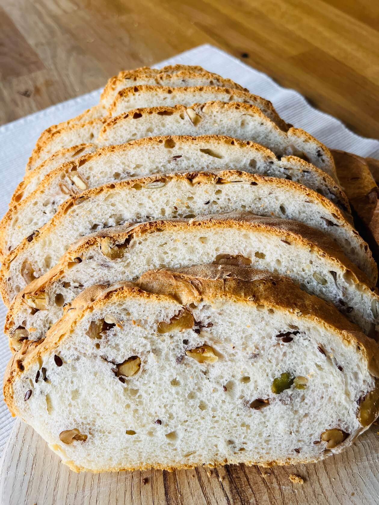 Details : wheat flour, German whole grain flour, Sourdough, salt, sugar, butter, walnuts, pumpkinseeds, sunflower seeds, flaxseeds, pure water